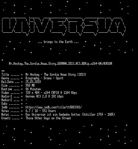 | FiLENAME: | Mr.Hockey.The.Gordie.Howe.Story.GERMAN.2013.AC3.BDRip.x264-UNiVERSUM.mkv |