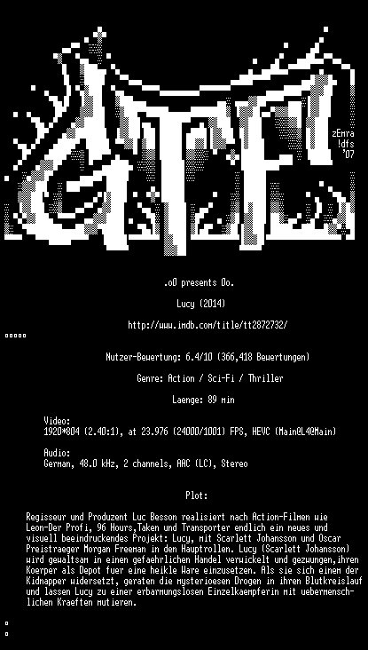 | FiLENAME: | Lucy.German.2014.1080p.BluRay.x265-DIRFIX-GTF.mkv |