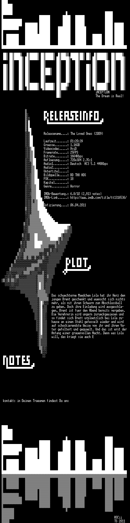 | FiLENAME: | The.Loved.Ones.2009.German.AC3.BDRip.XviD-iNCEPTiON.avi |