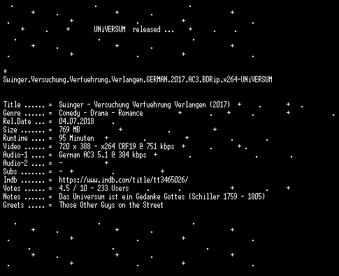 | FiLENAME: | Swinger.Versuchung.Verfuehrung.Verlangen.GERMAN.2017.AC3.BDRip.x264-UNiVERSUM.mkv |