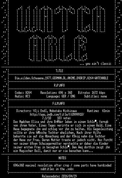 | FiLENAME: | Die.wilden.Schwaene.1977.GERMAN.DL.ANIME.DVDRIP.X264-WATCHABLE.mkv |