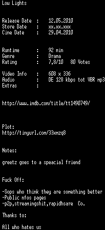 | FiLENAME: | Low.Lights.German.DVDRip.XviD-DiSTRiCT.avi |