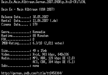| FiLENAME: | Dein.Ex.Mein.Albtraum.German.2007.DVDRip.XviD-CRiTiCAL.avi |