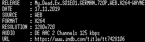 | FiLENAME: | My.Dead.Ex.S01E01.GERMAN.720P.WEB.X264-WAYNE.mkv |