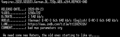 | FiLENAME: | Vampires.2020.S01E03.German.DL.720p.WEB.x264.REPACK-OHD.mkv |
