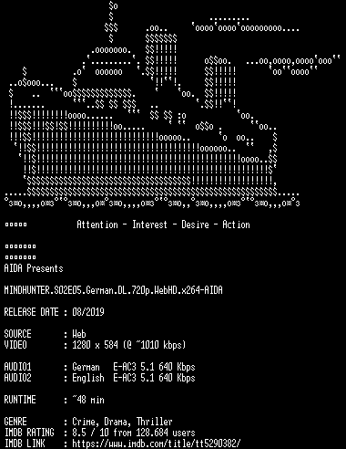 | FiLENAME: | MINDHUNTER.S02E05.German.DL.720p.WebHD.x264-AIDA.mkv |