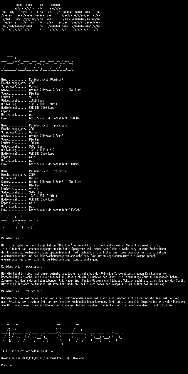 | FiLENAME: | Resident Evil (2002) [GER-dts 1080p BD].mkv |