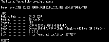 | FiLENAME: | Perry.Mason.2020.S01E03.GERMAN.DUBBED.DL.720p.WEB.x264.iNTERNAL-TMSF.mkv |