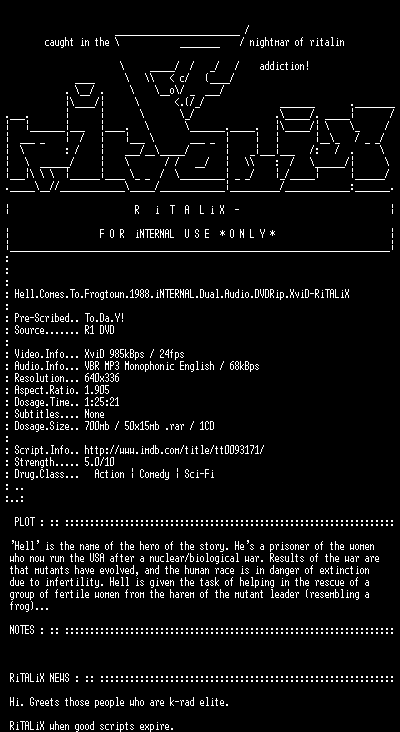 | FiLENAME: | Hell.Comes.To.Frogtown.1988.iNTERNAL.Dual.Audio.DVDRip.XviD-RiTALiX.avi |