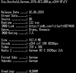 | FiLENAME: | Die.Unschuld.German.1976.AC3.BDRip.x264-SPiCY.mkv |