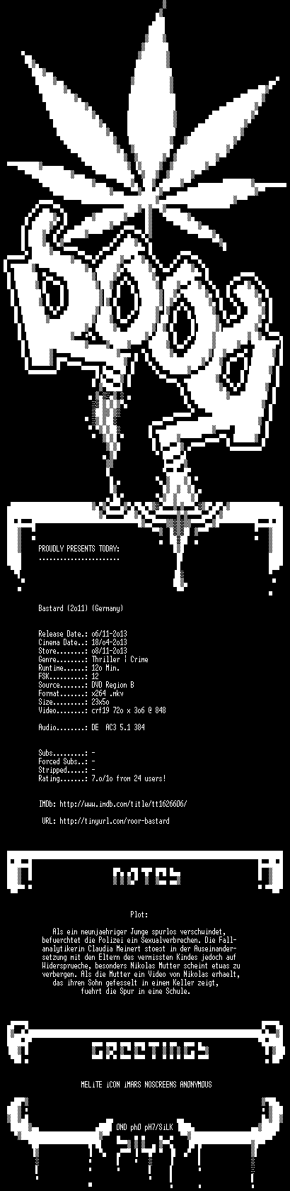 | FiLENAME: | Bastard.German.DVDRiP.x264-ROOR.mkv |