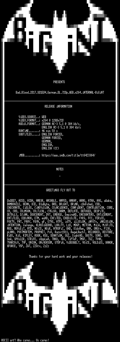 | FiLENAME: | Bad.Blood.2017.S01E04.German.DL.720p.WEB.x264.iNTERNAL-BiGiNT.mkv |