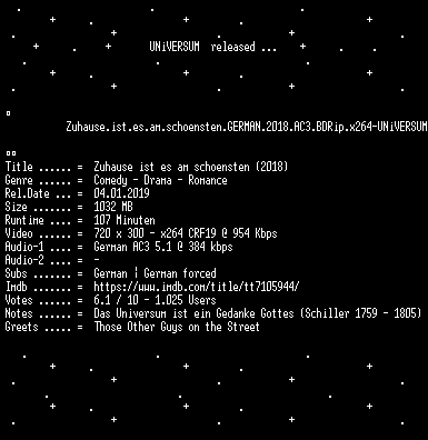 | FiLENAME: | Zuhause.ist.es.am.schoensten.GERMAN.2018.AC3.BDRip.x264-UNiVERSUM.mkv |