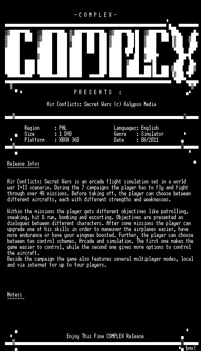 | FiLENAME: | Air.Conflicts.Secret.Wars.PAL.XBOX360-COMPLEX.iso |