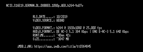 | FiLENAME: | NCIS.S16E19.GERMAN.DL.DUBBED.1080p.WEB.h264-VoDTv.mkv |