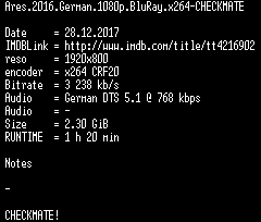 | FiLENAME: | Ares.2016.German.1080p.BluRay.x264-CHECKMATE.mkv |