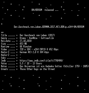 | FiLENAME: | Der.Geschmack.von.Leben.GERMAN.2017.AC3.BDRip.x264-UNiVERSUM.mkv |