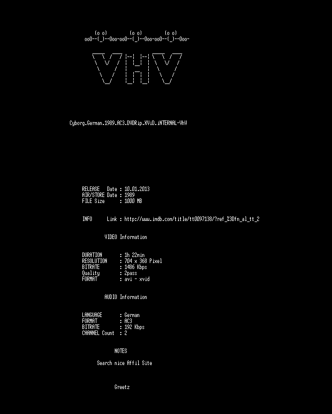 | FiLENAME: | Cyborg.German.1989.AC3.DVDRip.XViD.iNTERNAL-VhV.avi |