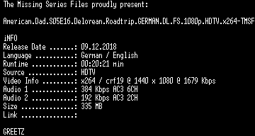 | FiLENAME: | American.Dad.S05E16.Delorean.Roadtrip.GERMAN.DL.FS.1080p.HDTV.x264-TMSF.mkv |
