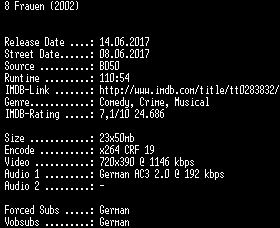 | FiLENAME: | 8.Frauen.German.REMASTERED.2002.AC3.BDRip.x264-SPiCY.mkv |