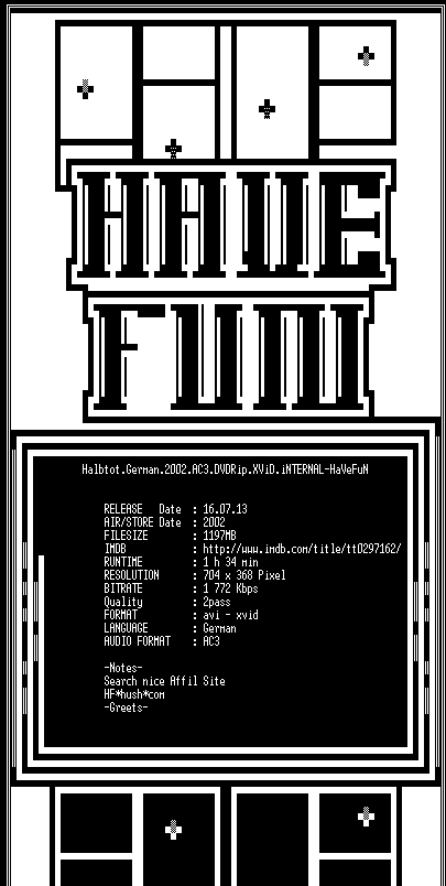 | FiLENAME: | Halbtot.German.2002.AC3.DVDRip.XViD.iNTERNAL-HaVeFuN.avi |