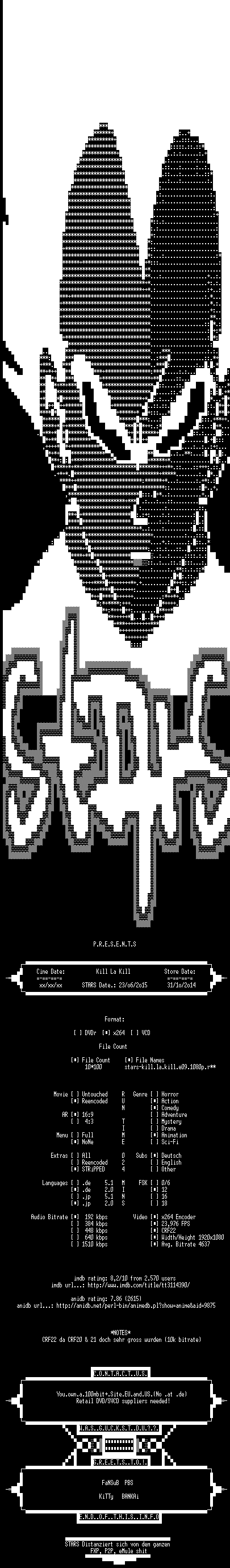 | FiLENAME: | Kill.La.Kill.E09.Nur.eine.Chance.German.2013.ANiME.DL.1080p.BluRay.x264-STARS.mkv |