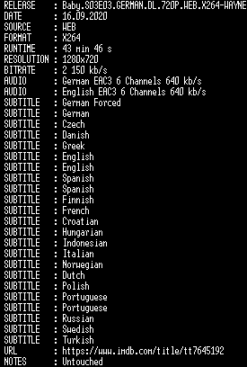 | FiLENAME: | Baby.S03E03.GERMAN.DL.720P.WEB.X264-WAYNE.mkv |