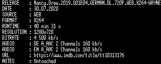 | FiLENAME: | Nancy.Drew.2019.S01E04.GERMAN.DL.720P.WEB.X264-WAYNE.mkv |