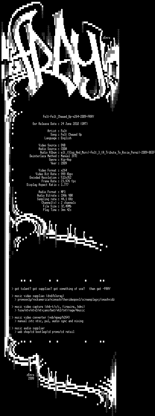| FiLENAME: | Felt-Felt_Chewed_Up-x264-2009-FRAY.mkv |