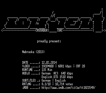 | FiLENAME: | Nebraska.German.DL.1080p.BluRay.x264-CONFiDENT.mkv |