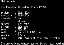 | FiLENAME: | Die.Todeshand.des.gelben.Adlers.1979.German.BDRip.x264-CWA.mkv |