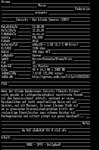 | FiLENAME: | Zatoichi.Der.blinde.Samurai.German.2003.AC3.DVDRiP.iNTERNAL.XViD-XMF.CD2.avi |