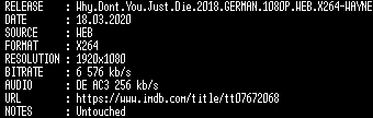 | FiLENAME: | Why.Dont.You.Just.Die.2018.GERMAN.1080P.WEB.X264-WAYNE.mkv |