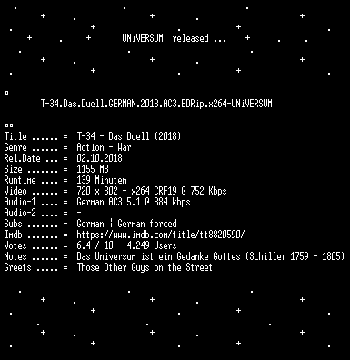 | FiLENAME: | T-34.Das.Duell.GERMAN.2018.AC3.BDRip.x264-UNiVERSUM.mkv |