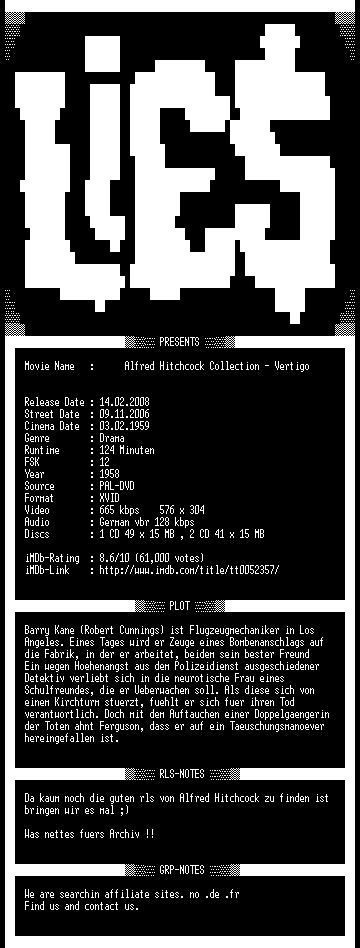 | FiLENAME: | 043.Vertigo.GERMAN.1958.DVDRiP.iNTERNAL.XviD-LieS.avi |