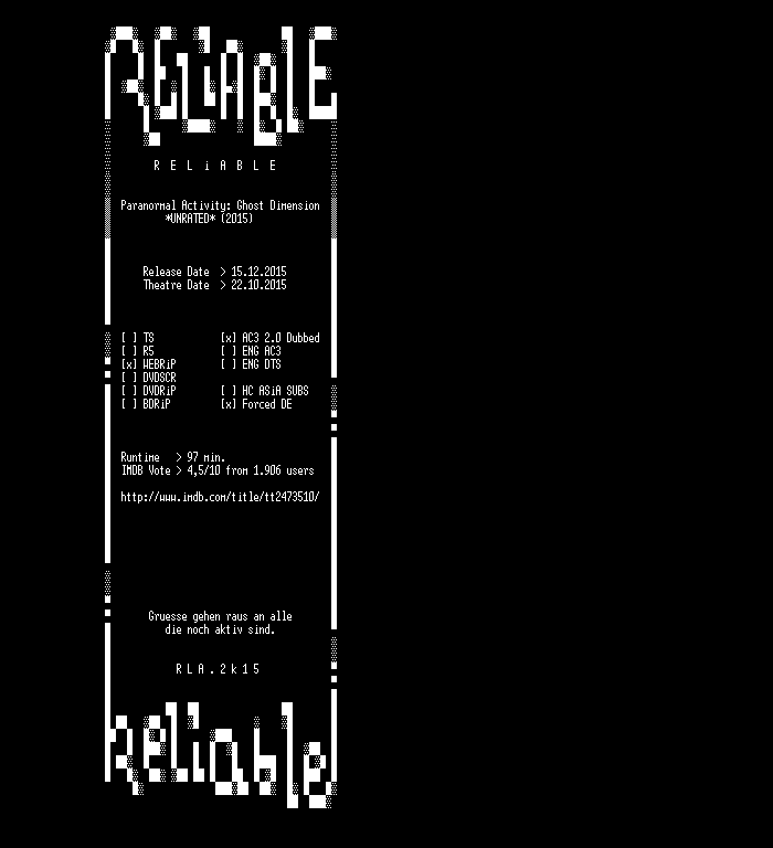 | FiLENAME: | Paranormal.Activity.Ghost.Dimension.UNRATED.WEBRiP.LD.GERMAN.x264-RELiABLE.mkv |