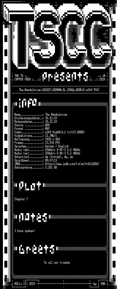 | FiLENAME: | The.Mandalorian.S01E07.GERMAN.DL.1080p.WEBRiP.x264-TSCC.mkv |