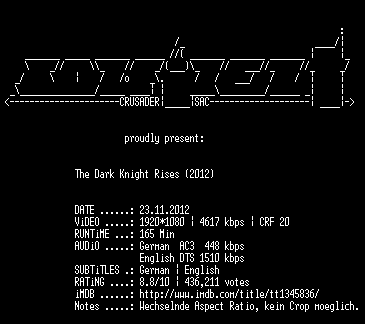 | FiLENAME: | The.Dark.Knight.Rises.German.DL.1080p.BluRay.x264-CONFiDENT.mkv |