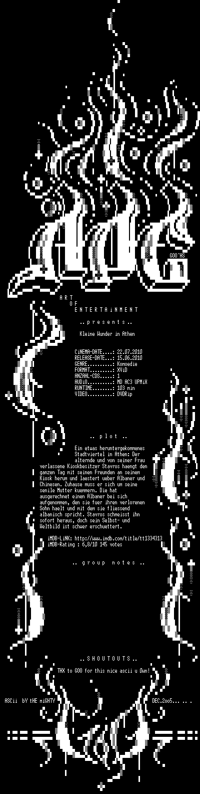 | FiLENAME: | Kleine.Wunder.in.Athen.DVDRiP.MD.German.XViD-AOE.avi |