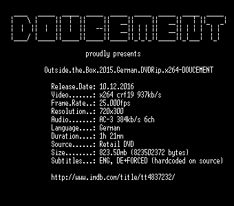 | FiLENAME: | Outside.the.Box.2015.German.DVDRip.x264-DOUCEMENT.mkv |