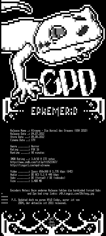 | FiLENAME: | Alraune.Die.Wurzel.des.Grauens.2010.German.AC3.PROPER.BDRip.XviD-EPHEMERiD.avi |