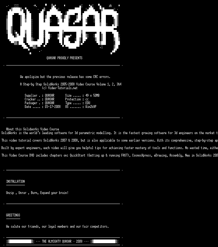 | FiLENAME: | SolidWorks v2005-v2008 Video Course Tutorial Volume 1-4 DVDR REPACK-QUASAR.iso |