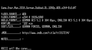 | FiLENAME: | Game.Over.Man.2018.German.Dubbed.DL.1080p.WEB.x264.iNTERNAL-BiGiNT.mkv |