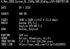 | FiLENAME: | X.Men.2000.German.DL.2160p.UHD.BluRay.x265-ENDSTATiON.mkv |
