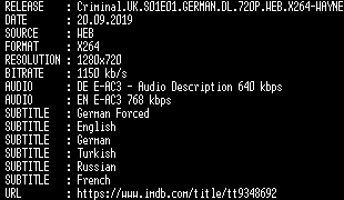 | FiLENAME: | Criminal.UK.S01E01.GERMAN.DL.720P.WEB.X264-WAYNE.mkv |