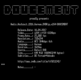 | FiLENAME: | Hedis.Hochzeit.2016.German.DVDRip.x264-DOUCEMENT.mkv |