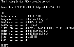 | FiLENAME: | Queen.Sono.S01E06.GERMAN.DL.720p.WebHD.x264-TMSF.mkv |