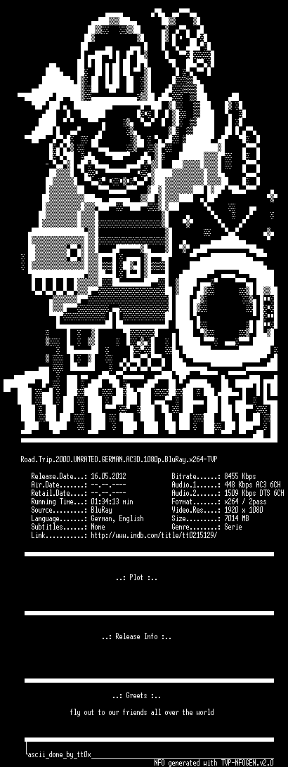 | FiLENAME: | Road.Trip.2000.UNRATED.GERMAN.AC3D.1080p.BluRay.x264-TVP.mkv |