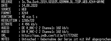 | FiLENAME: | In.The.Dark.2019.S01E05.GERMAN.DL.720P.WEB.X264-WAYNE.mkv |