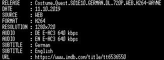 | FiLENAME: | Costume.Quest.S01E10.GERMAN.DL.720P.WEB.H264-WAYNE.mkv |